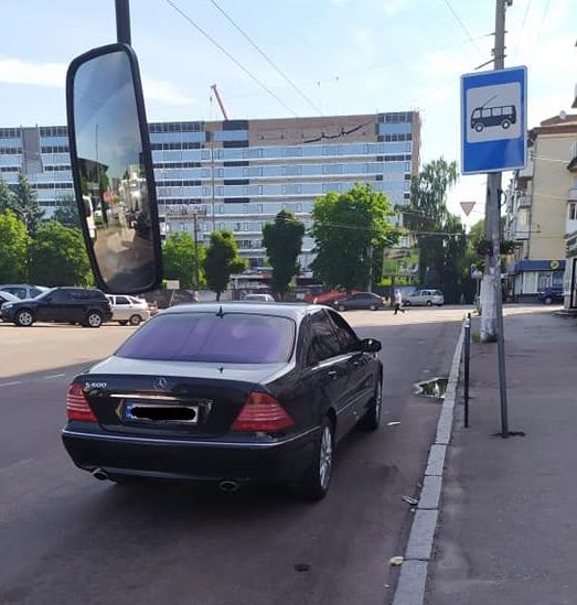Водій чорного «мерседесу» зупинився прямо перед зупинкою громадського транспорту, тим самим створивши перешкоду для водіїв маршруток та тролейбусів, які там зупиняються, – такий собі водій-егоїст, думає виключно про себе.