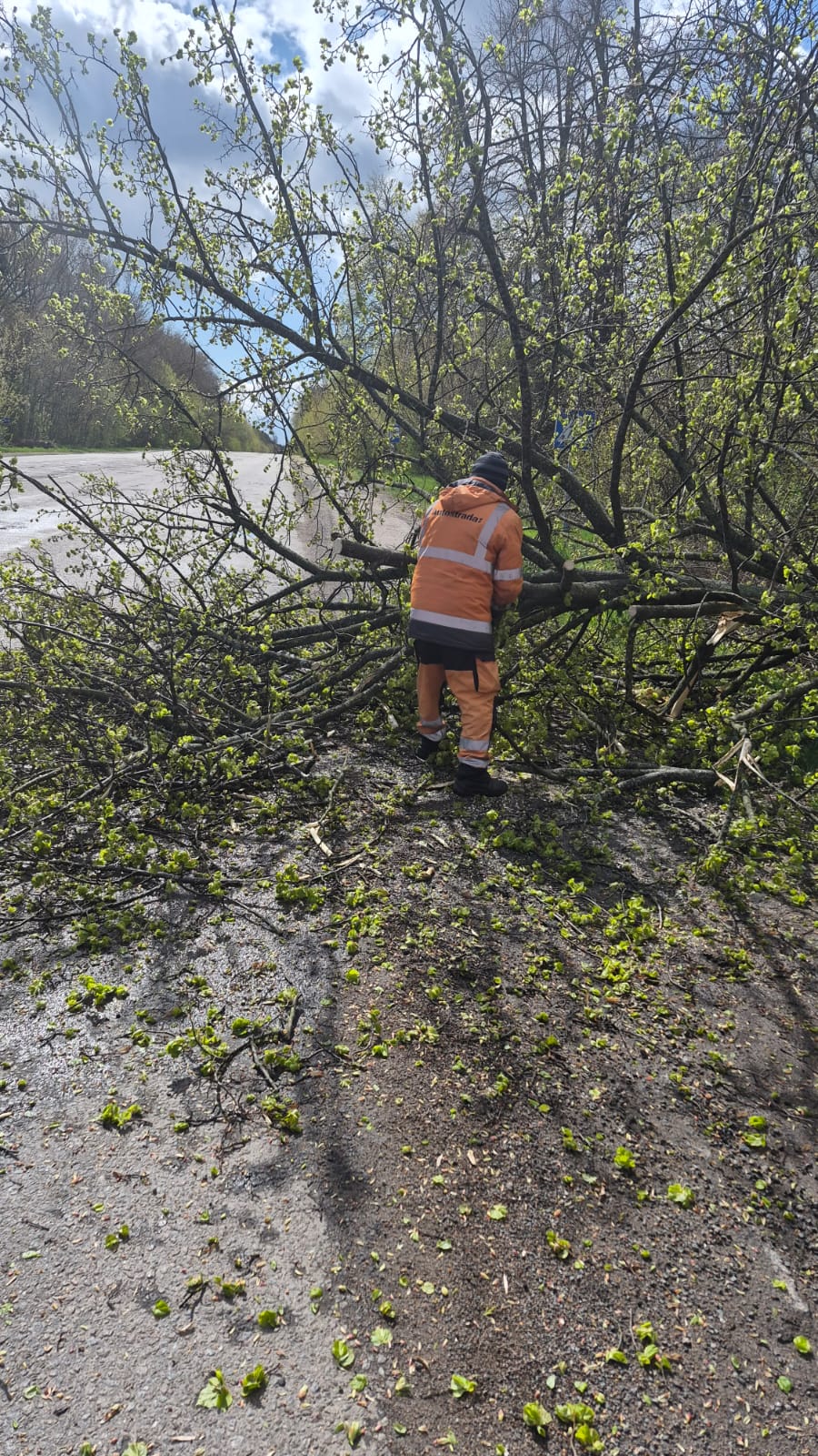 Потужні пориви вітру, що досягали 25 м/с на території області виривали дерева з корінням, ламали кремезні гілки. Перешкоди з доріг держзначення оперативно прибирали працівники дорожнього підрядного підприємства.