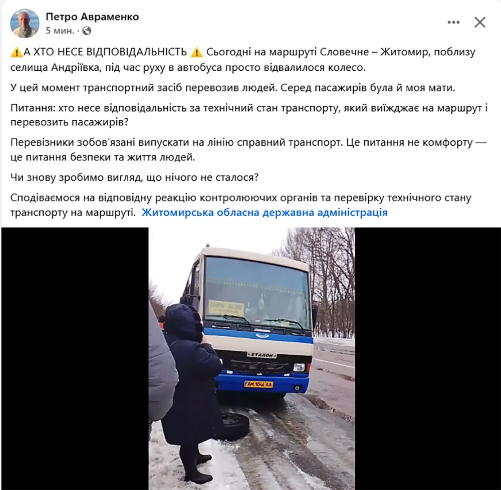Петро Авраменко пише: "А ХТО НЕСЕ ВІДПОВІДАЛЬНІСТЬ? Сьогодні на маршруті Словечне – Житомир, поблизу селища Андріївка, під час руху в автобуса просто відвалилося колесо. У цей момент транспортний засіб перевозив людей. Серед пасажирів була й моя мати. Питання: хто несе відповідальність за технічний стан транспорту, який виїжджає на маршрут і перевозить пасажирів? Перевізники зобов’язані випускати на лінію справний транспорт. Це питання не комфорту — це питання безпеки та життя людей. Чи знову зробимо вигляд, що нічого не сталося? Сподіваємося на відповідну реакцію контролюючих органів та перевірку технічного стану транспорту на маршруті"