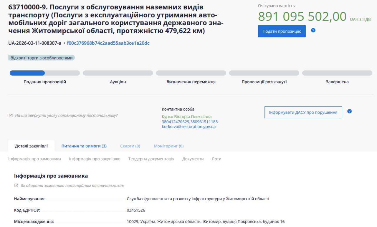 За обслуговування майже 480 кілометрів трас держава готова заплатити понад 891 мільйон гривень. Відповідну закупівлю 11 березня 2026 року оголосила Служба відновлення та розвитку інфраструктури у Житомирській області через систему публічних закупівель Prozorro.
