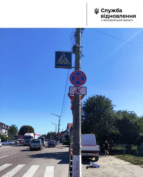 У місті Чуднів на дорозі Н-03 поновили, відповідно до схеми ОДР, кілька знаків, що забороняють зупинку: «3.34».