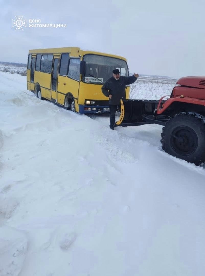 Вчора вранці неподалік села Демчин Бердичівського району фахівці ДСНС витягли з дорожніх заметів рейсовий автобус. На момент прибуття у транспорті перебували троє пасажирів. За допомогою тросу автобус відбуксирували на безпечну ділянку, після чого поїздку було продовжено.