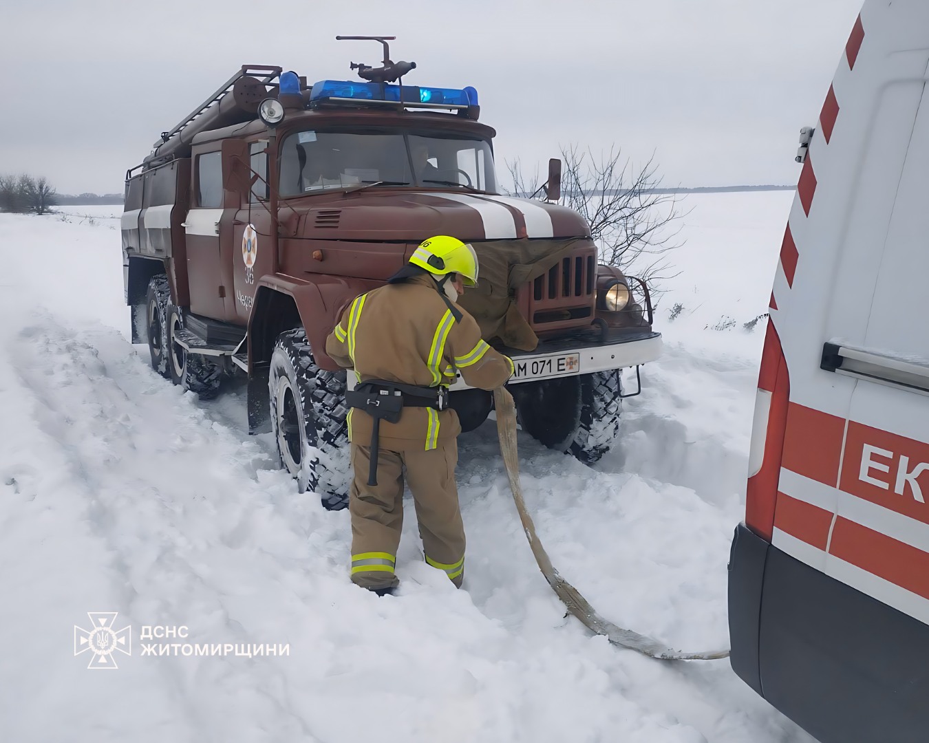 Другий випадок стався поблизу с. Городківка Бердичівського району: під час руху на виклик «швидка» застрягла у снігу, рятувальники допомогли відбуксирувати авто.