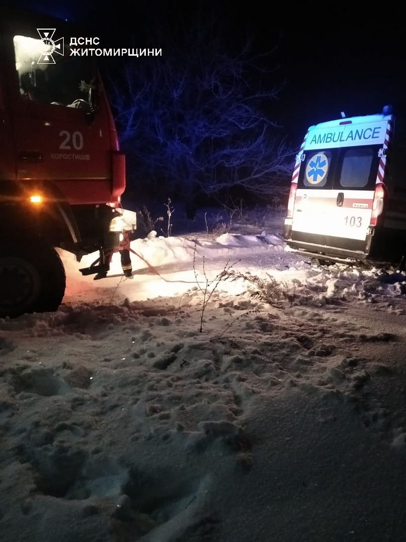 У нічний час рятувальники надали допомогу медикам, автомобіль яких повертався з виклику та застряг у сніговому заметі на полі поблизу с. Колодязьки Житомирського району. За допомогою лебідки пожежного автомобіля «швидку» відбуксирували на проїзджу частину дороги.