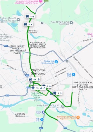Варто також згадати автобусного дублера — маршрут №4 «Крошня (Андріївська) – Обласна дитяча лікарня». Він курсує і у вихідні, причому значно частіше — з інтервалом 20–25 хвилин. На відміну від тролейбуса, автобус їде прямо — без кола через центр та вул. Фещенка-Чопівського, що робить маршрут коротшим за часом і зручнішим.