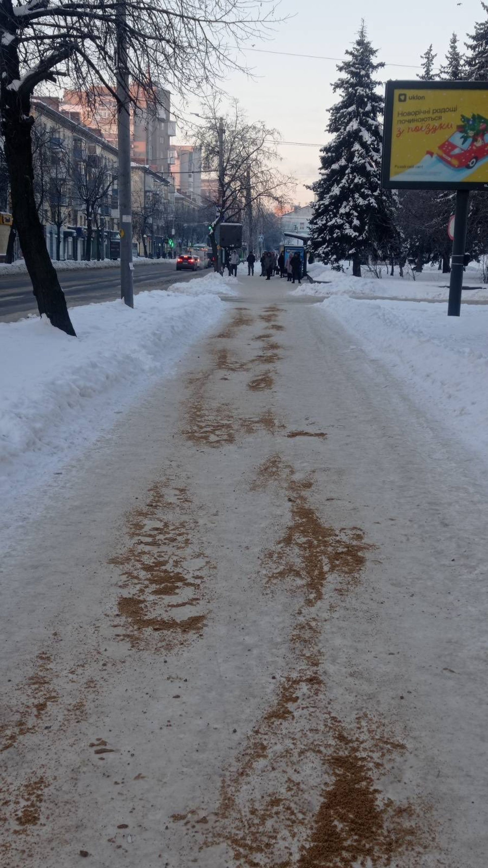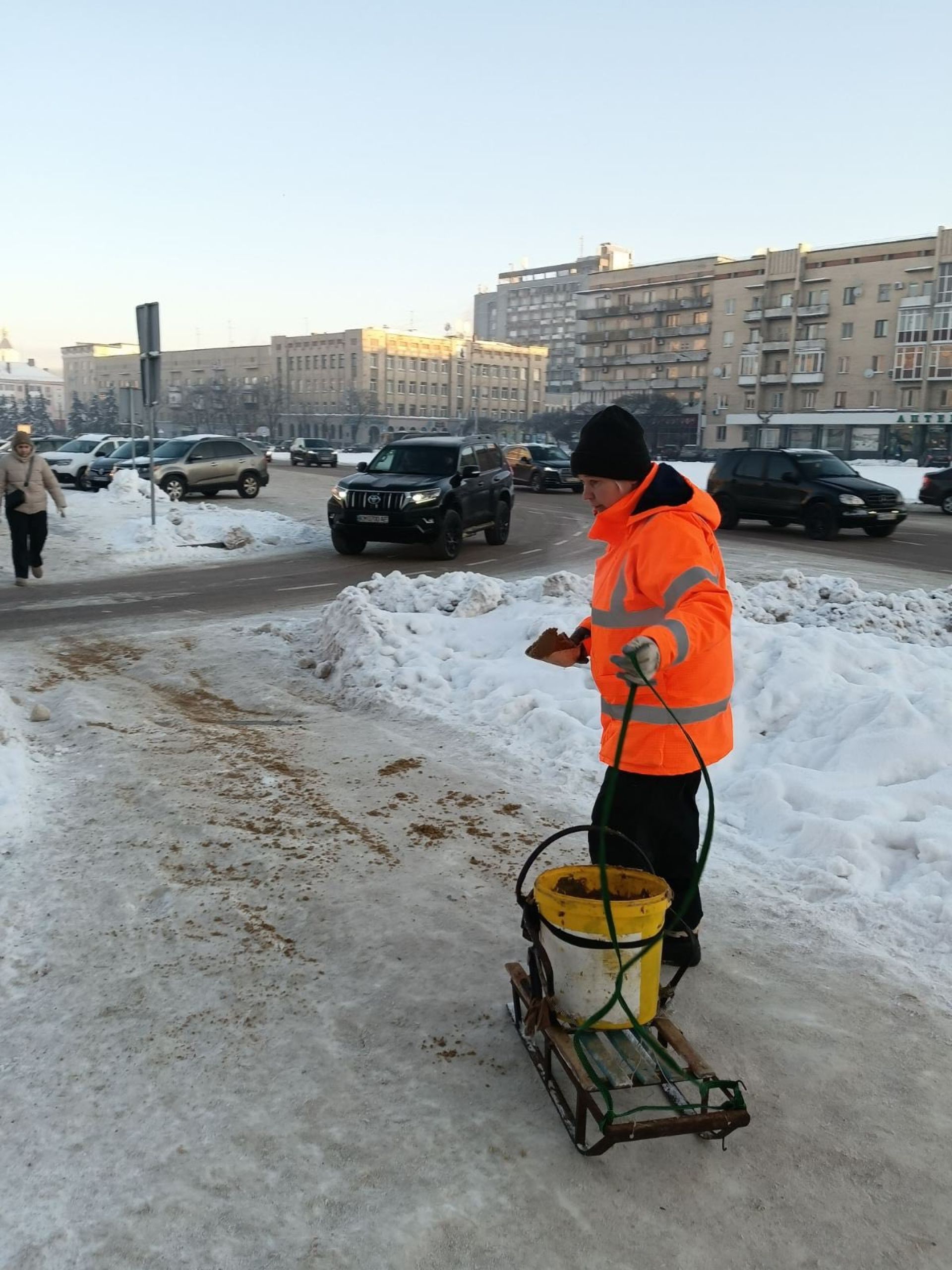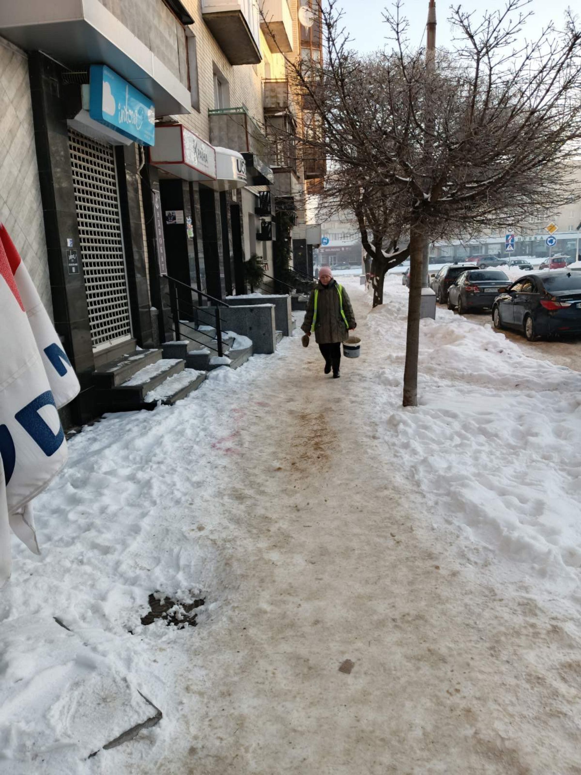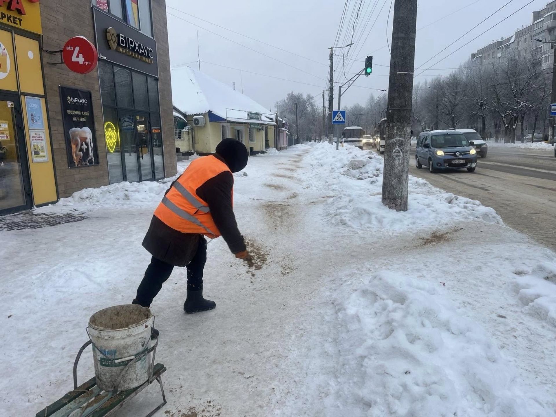 У місті тривають роботи з розчищення та посипання тротуарів. Фоторепортаж