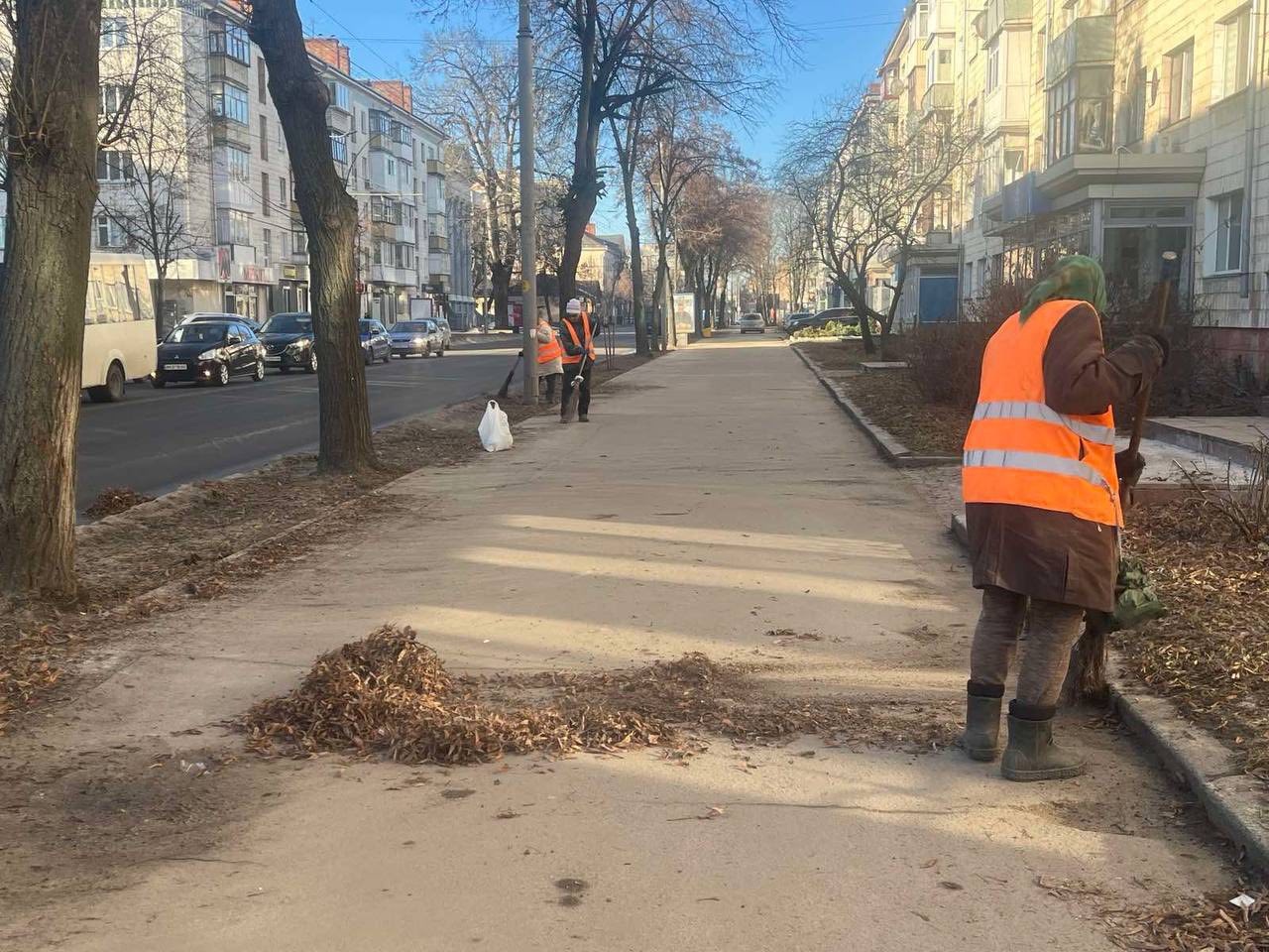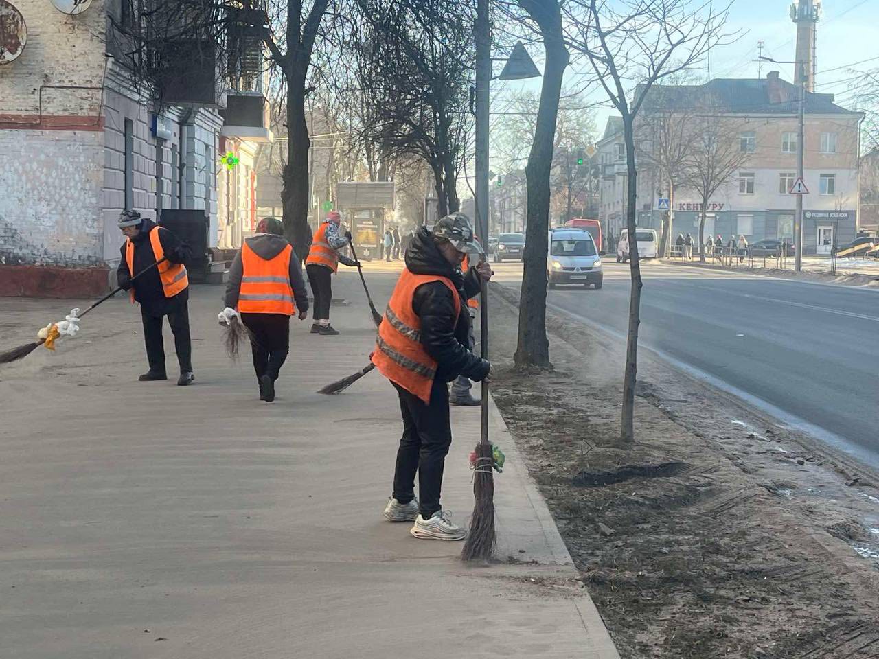 Працівники КП «Управління автомобільних шляхів» сьогодні прибирають узбіччя та тротуари на вулицях Київській, Сціборського та Театральній.