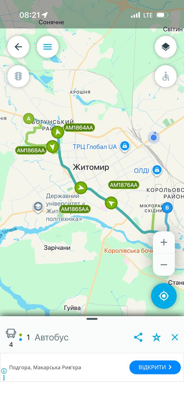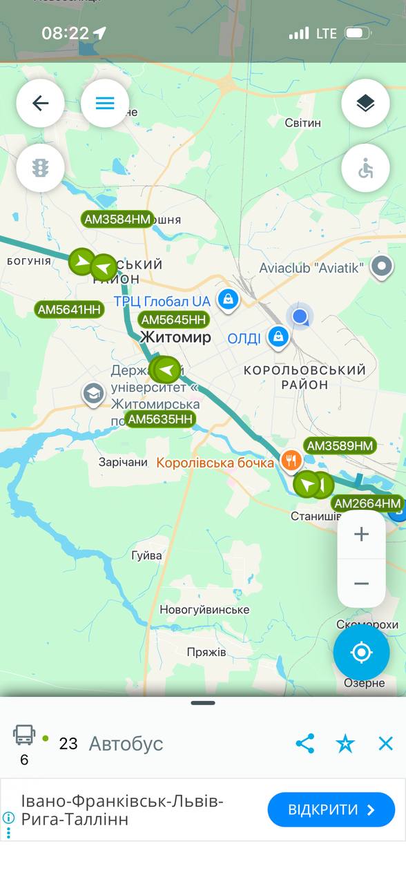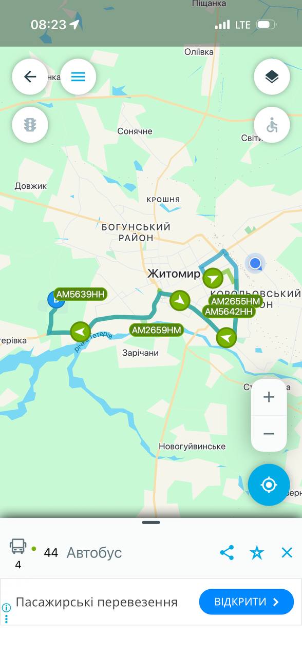 Наразі в застосунках для відстеження руху громадського транспорту на маршрутах, які обслуговує КП «ЖТТУ», відображається така кількість транспорту: №1: 4 автобуси з 8 потрібних; №23: 6 автобусів з 8 потрібних; №44: 4 автобуси з 6 потрібних. Чи є якісь автобуси, які не відображаються в системі але фактично працюють — невідомо.