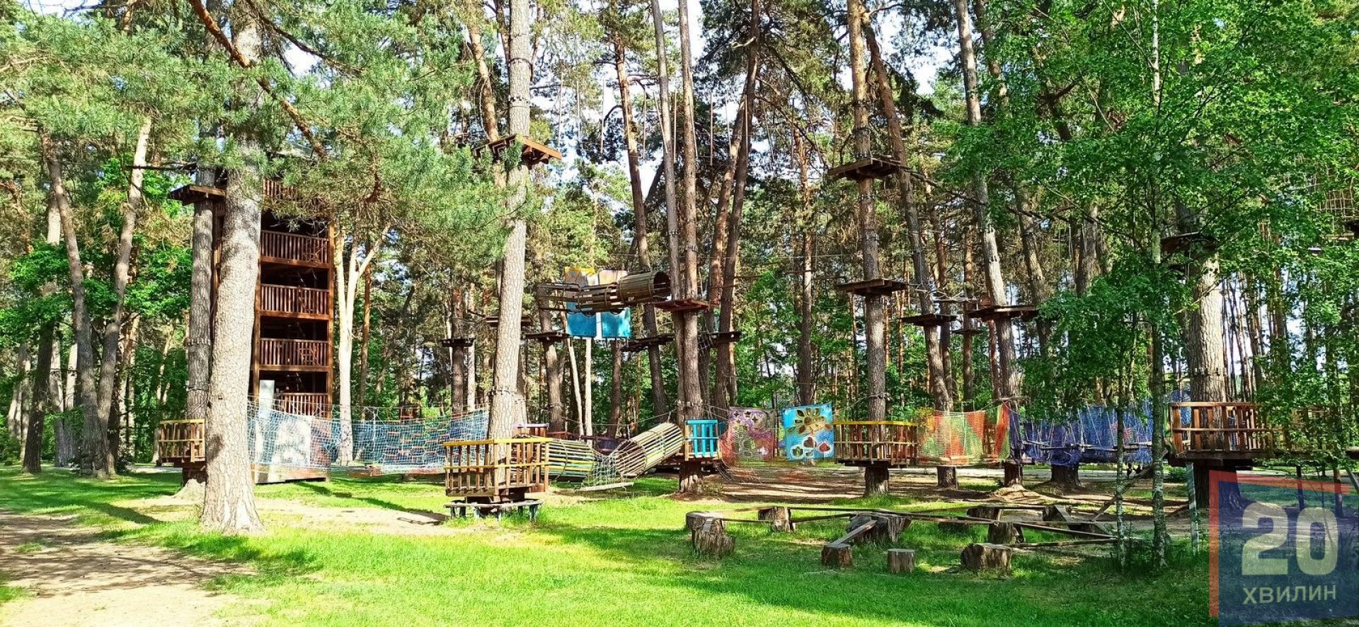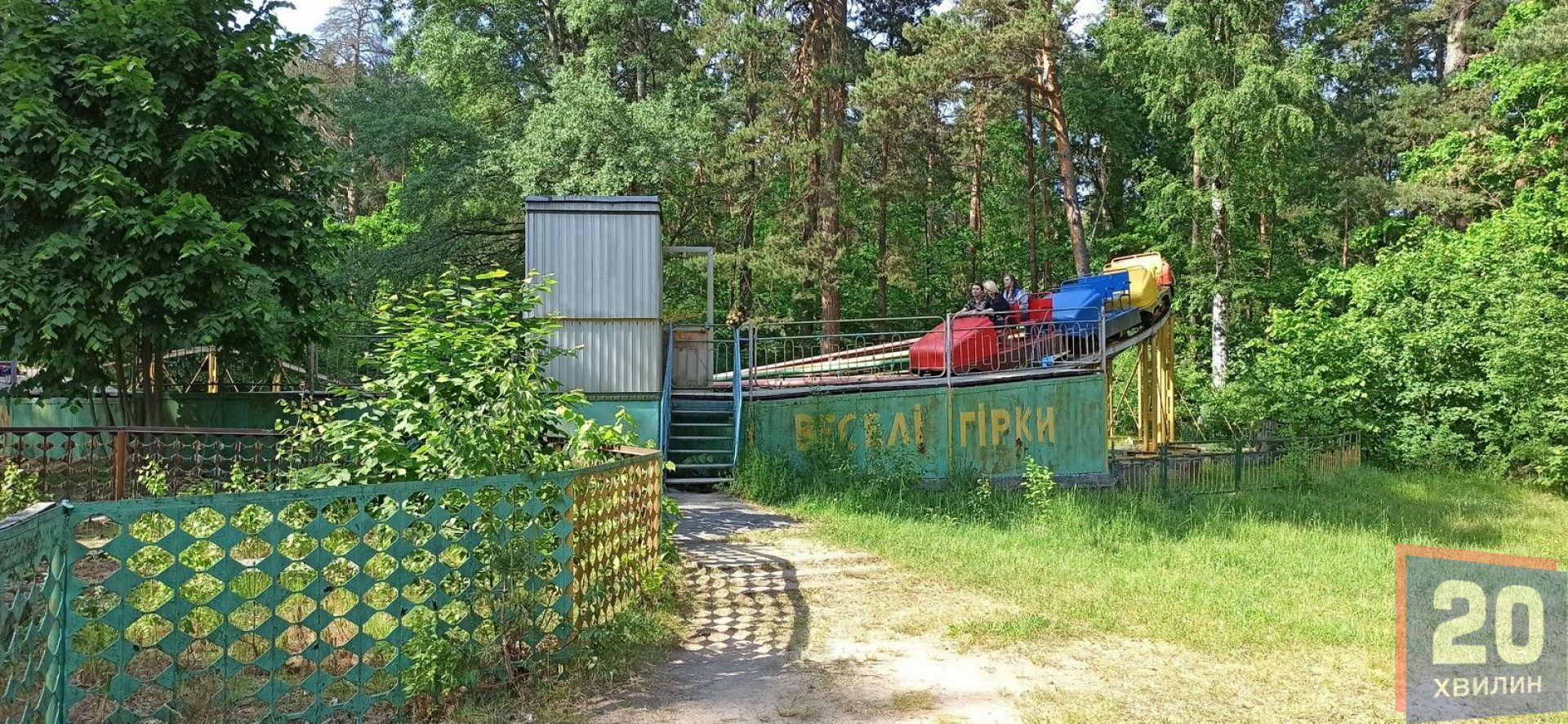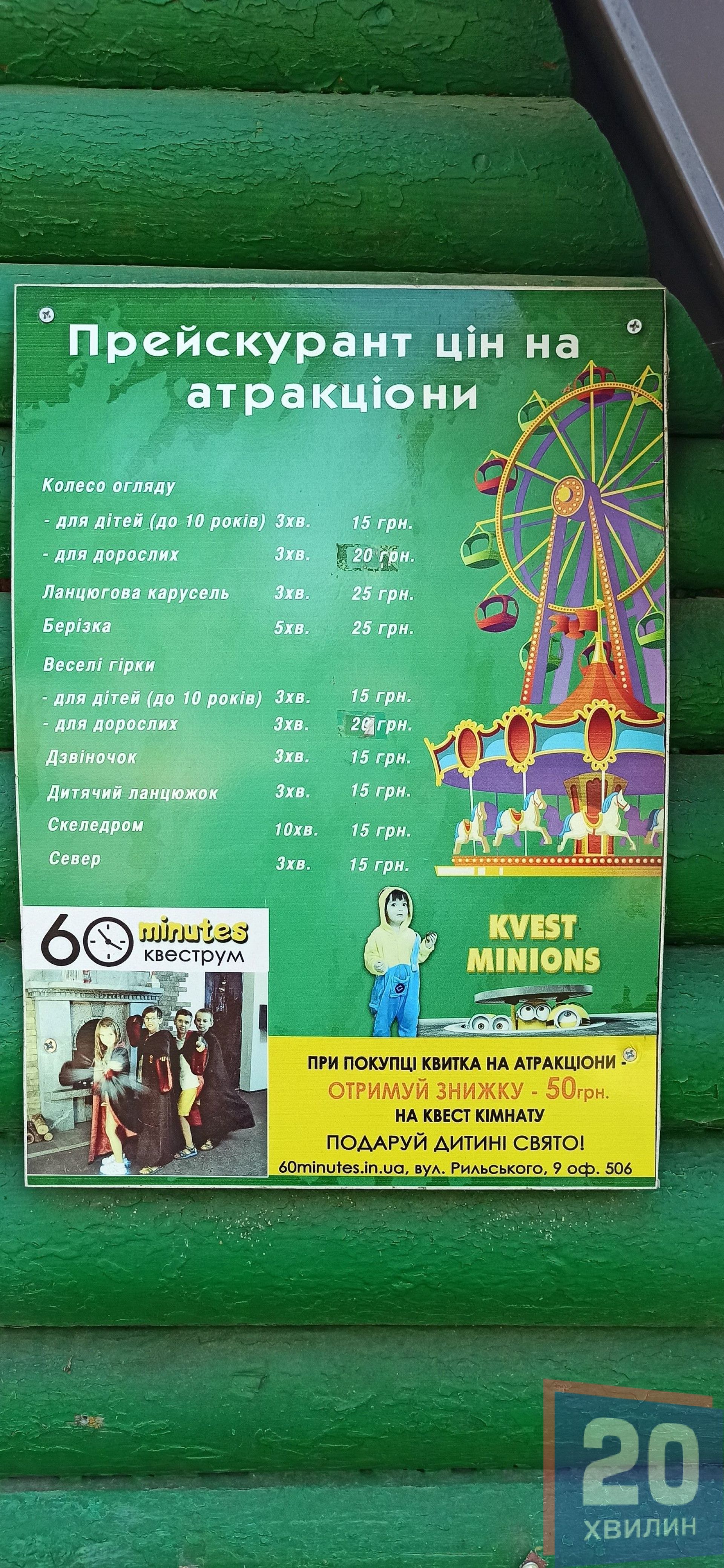 Сама територія прибрана, доріжки чисті. Поряд працюють кілька старих атракціонів. В більшості для зовсім маленьких діточок. Ціни, зазначені в прайсі, не дуже високі. Атракціонів для більш дорослого населення немає взагалі. Також не працює велике оглядове колесо. Натомість майже вся територія перетворена на туристично-тренувальну базу. На деревах натягнуті канати, мотузкові конструкції та багато іншого туристичного приладдя.