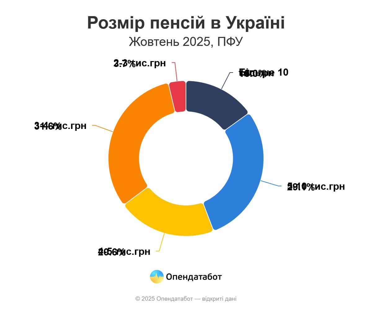 Більше 10 тис.грн 1 534 695 15.0% 5-10 тис.грн 2 972 167 29.1% 4-5 тис.грн 2 099 212 20.6% 3-4 тис.грн 3 220 307 31.6% 2-3 тис.грн 373 261 3.7% Водночас є й ті, хто отримує більше. Так, близько 1,5 мільйона людей, або 15% усіх пенсіонерів, мають середню виплату 15 750 грн — це приблизно 325 євро. Ще майже 3 мільйони українських пенсіонерів отримують, у середньому 6 860 грн, а 2,1 мільйона — лише 4 510 грн.