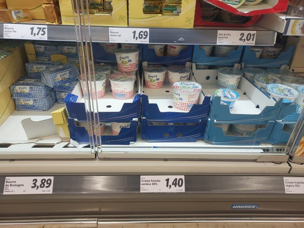 Середня ціна на 200-грамову пачку масла жирністю 82,5% – 52 грн (1,69 €). Нам пощастило, і у місцевому супермаркеті ми знайшли масло тієї ж жирності за акційною ціною – 44,40 грн, тоді як звичайна – 51 грн. Сметану 15% жирності можна придбати у французькому супермаркеті за 32 грн (1,05 €), 30% жирності – 42,39 грн (1,4 €). У житомирському супермаркеті на час моніторингу сметани з жирністю 30% ми не виявили, а за 15% вагою 450 г потрібно заплатити 30,40 грн.