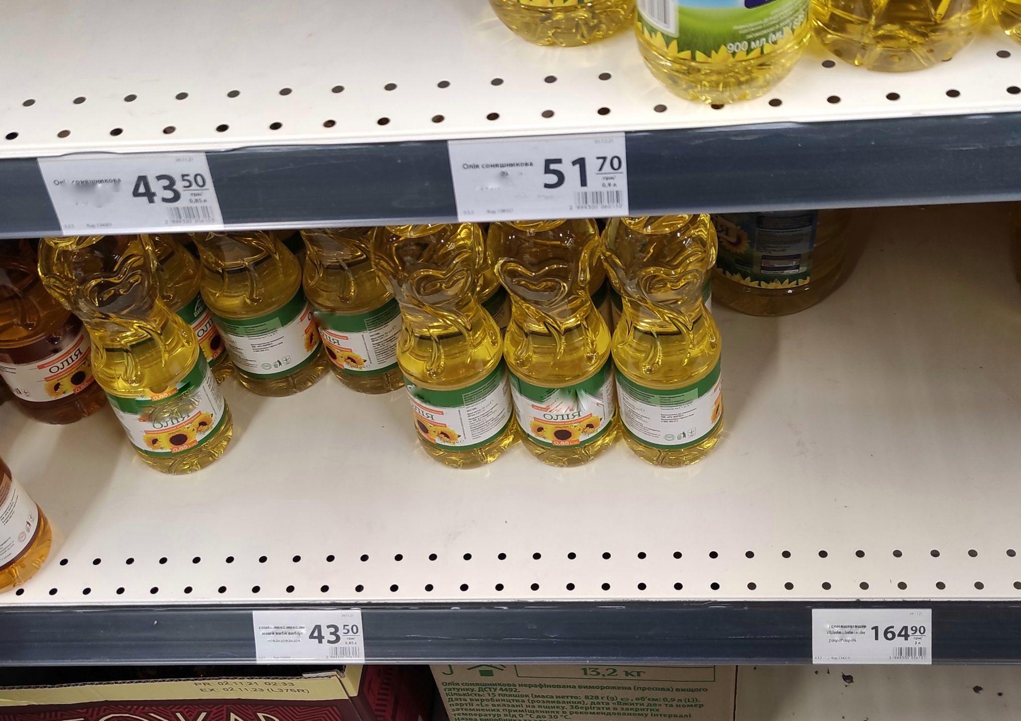 Літрову пляшку олії у французькому Ренні продають за 54,24 грн (1,76 €). А от знайти олію, фасовану у літрові пляшки, в обраній нами у Житомирі мережі виявилося непосильним завданням. Хвилин з 5 ми вивчали асортимент: 850 мл, 950 мл, 1,5 л. А от «чистий» літр знайти так і не вдалося. Тому вдамося до розрахунків, взявши пляшку найдешевшої олії 850 мл за 43,50 грн. 51, 17 грн – саме стільки коштуватиме літр.