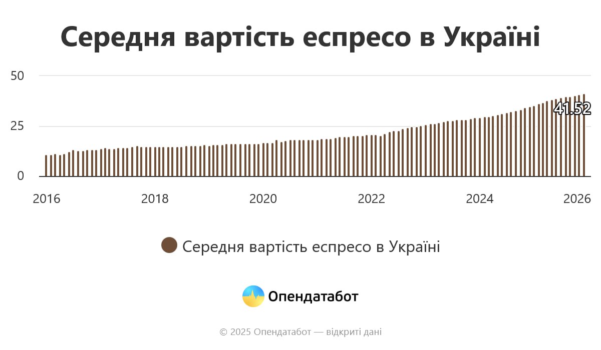 41 грн, в середньому, коштує чашка еспресо в Україні у грудні 2025 року.