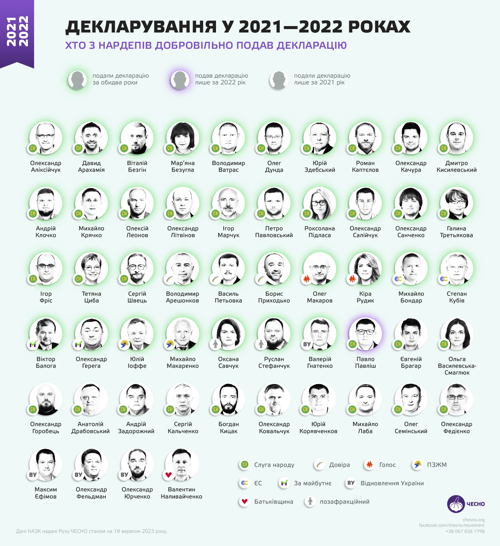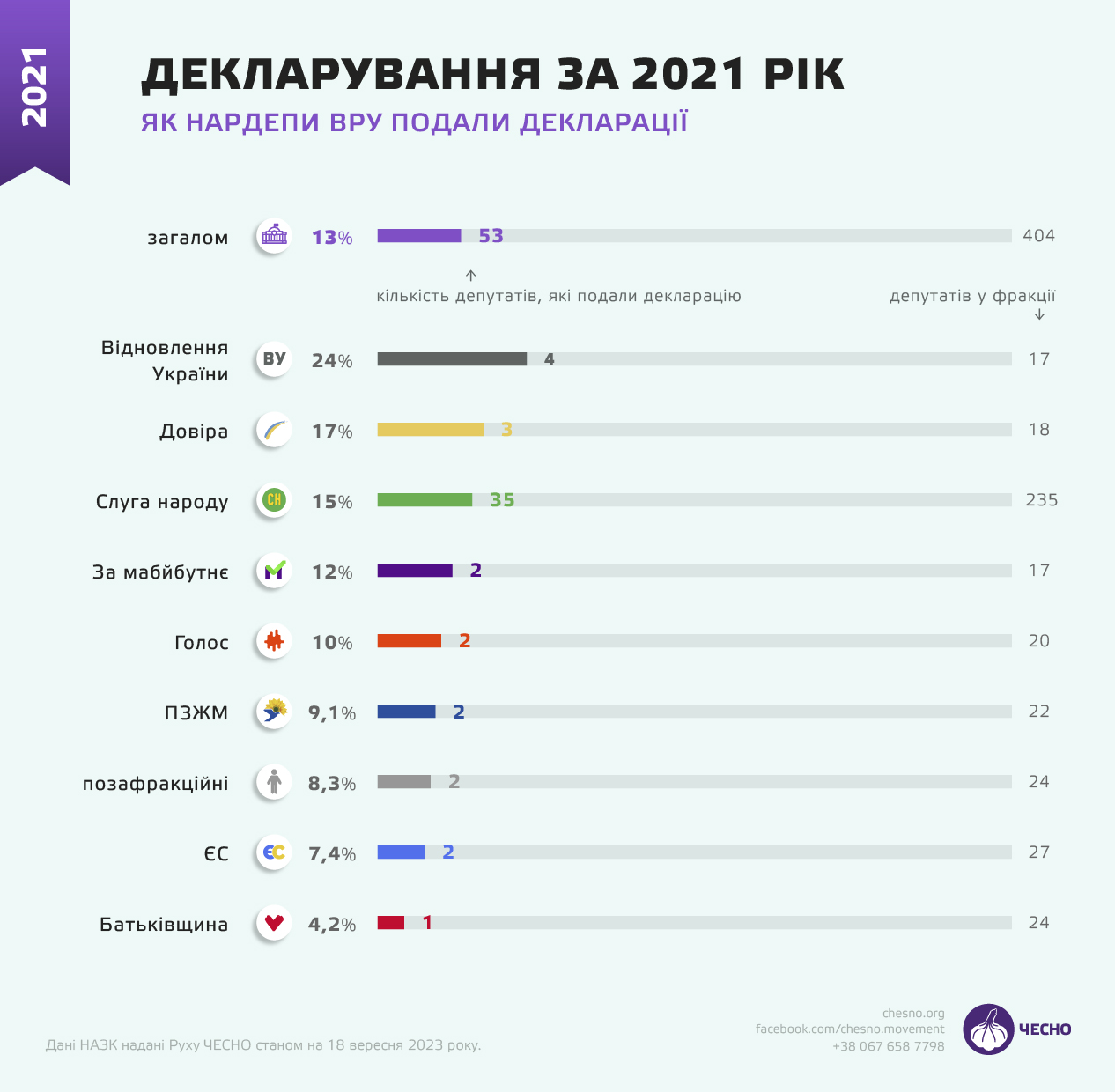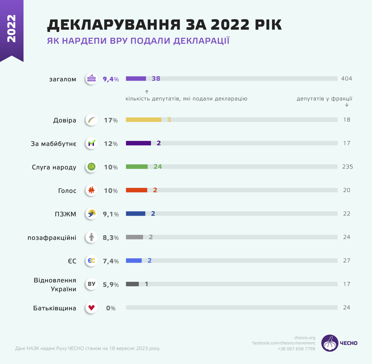 Лише 53 народні депутати добровільно подали майнові декларації за 2021 рік. За 2022 рік їхня кількість іще менша — 38. Такі дані Рух ЧЕСНО отримав від НАЗК наприкінці вересня.