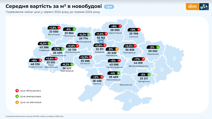 Як вказано у звіті, протягом останнього місяця середня ціна за м² в гривні в Україні зросла на 1,3%, протягом останнього півріччя — на 5,9%, а у масштабі року збільшення склало 7,6%. Найбільш стрімке зростання вартості квадратних метрів на первинному ринку спостерігається в Кіровоградській області, а найсуттєвіше зниження — у Запорізькій. Найвищою ціною за квадратний метр у новобудові традиційно вирізняється столиця — 55 182 грн/м². На Житомирщині ж квадратний метр житла на "первинці" у середньому обійдеться у 28 774 грн.