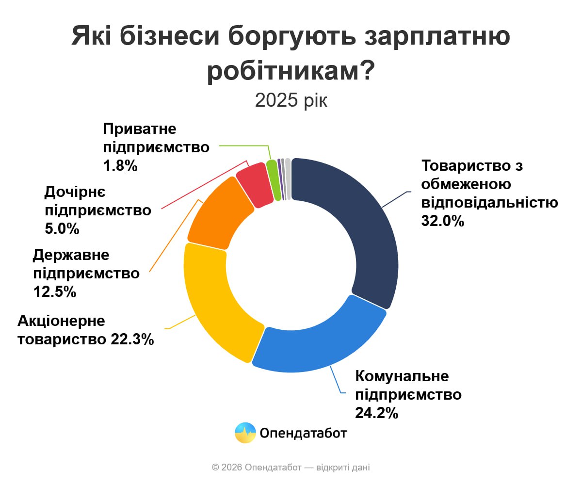Загалом майже дві тисячі активних справ були відкриті ще у 2017 році. Понад третину всіх відкритих торік проваджень припадає на Дніпропетровщину — 3,2 тисячі справ. Зі значним відривом негативний приклад наслідують бізнеси з Івано-Франківщини (1,1 тисячі), Сумщини (897) та Львівщини (770). Водночас лише 1 випадок зафіксовано на Луганщині, ще 4 у Чернівецькій області та 12 проваджень щодо боргів по зарплаті на Волині. Переважно, гроші затримують приватні компанії: 62% усіх боргів за 2025 рік. Ще чверть справ стосується комунальних підприємств і понад 13% — державних. Найчастіше фігурують товариства з обмеженою відповідальністю, комунальні та акціонерні підприємства.