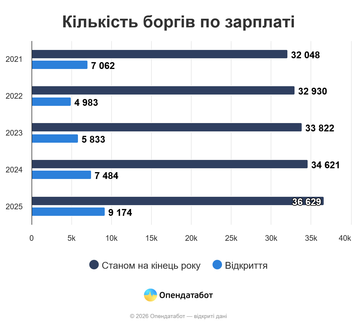 Понад 36,6 тисячі боргів по заробітній платі зафіксовано на початок 2026 року за даними Єдиного реєстру боржників. За рік боргів побільшало на 6%. Майже 2 тисячі справ беруть початок ще у 2017 році. Рекордні 9,1 тисячі проваджень щодо боргів по зарплаті було відкрито торік. Це на 30% більше, ніж у 2024 році. Понад чверть боргів припадає на компанії, що працюють у сфері виробництва хімпродукції.