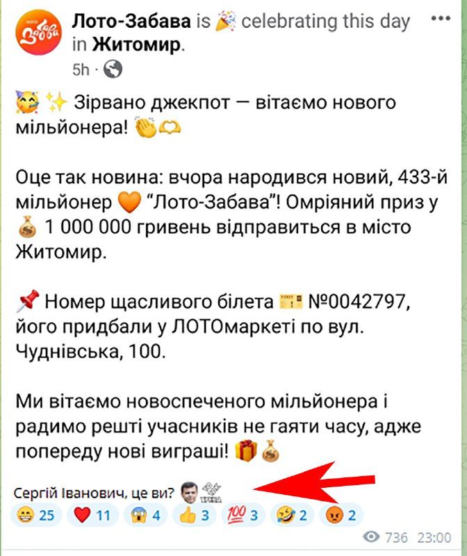 Виграшний білет під номером 0042797 був придбаний за 45 гривень у лотерейному кіоску, що знаходиться на вулиці Чуднівська, 100. Переможець вже звернувся до оператора державних лотерей «М.С.Л.» і розпочав процедуру оформлення виграшу. Наразі відомо, що виграти пощастило чоловіку на ім’я Андрій. Це вже другий мільйонер у цьому році та 433-й за всю історію проведення лотереї.