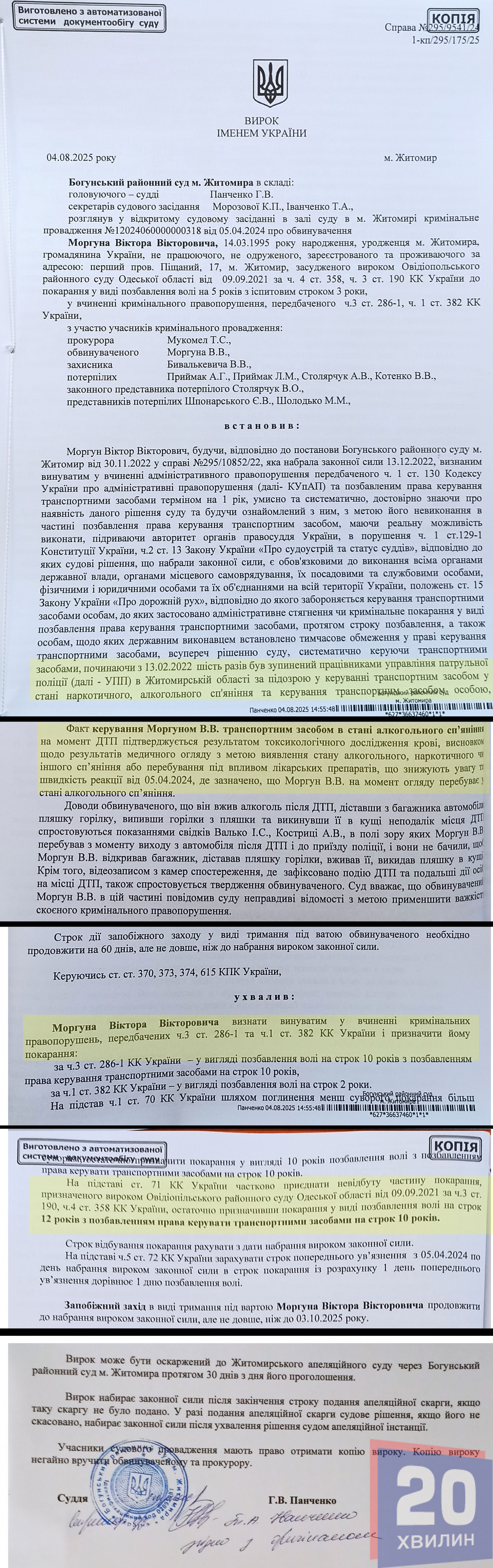 4 серпня 2025 року суд оголосив вирок: Моргуна Віктора Вікторовича визнати винуватим у вчиненні кримінальних порушень, передбачених ч.3 ст. 286-1 та ч.1 ст. 382 КК України та призначити йому покарання у вигляді позбавлення волі на строк 12 років з позбавленням права керування транспортними засобами на строк 10 років.