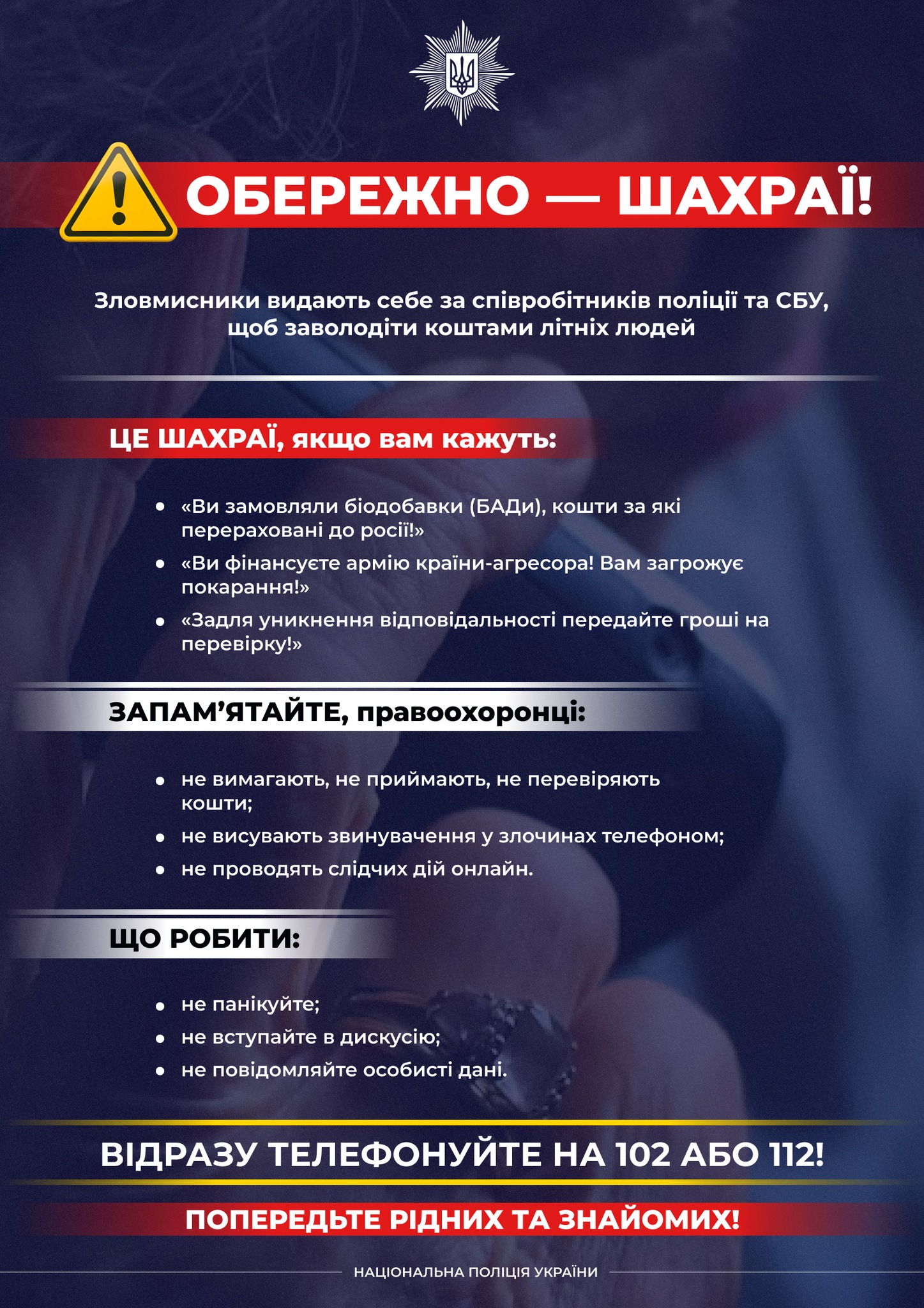 У разі отримання дзвінків чи повідомлень з обвинуваченнями і погрозами - негайно зверніться на спецлінію 102 або 112.