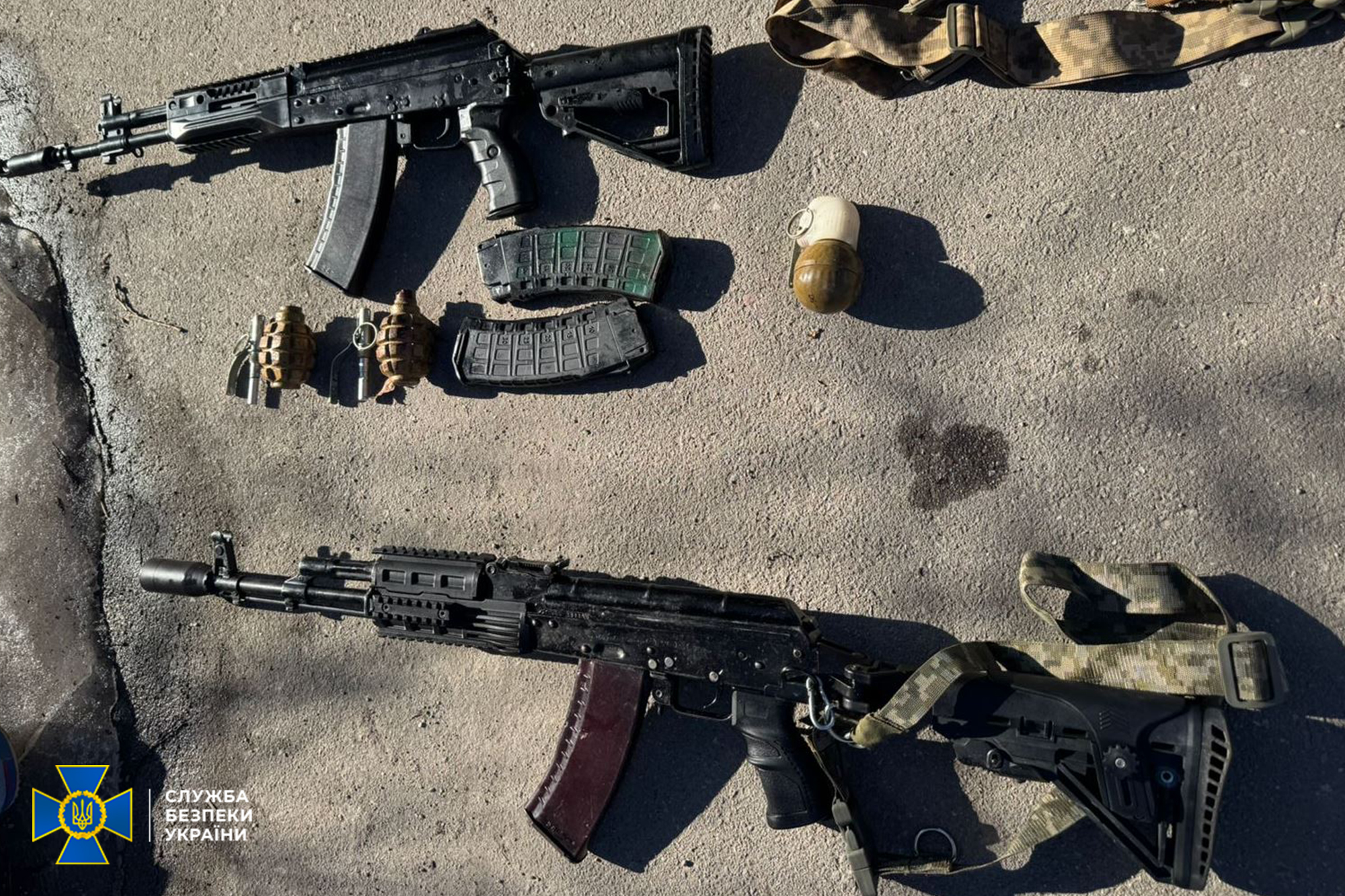 Серед вилученого – дві ручні осколкові гранати Ф-1, протипіхотна осколкова ударно-дистанційна граната РГН та два автомати Калашникова АК-12 і АК-74. Один із них – новий «домодернізований» автомат російського виробництва, який нині перебуває на озброєнні зс рф.