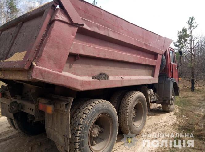 За повідмленням відділу комунікації поліції Житомирської області, близько 13 години працівники сектору реагування поліції Коростишівського відділу на лісовій дорозі поблизу селища зупинили «КАМАЗ» під керуванням 50-річного місцевого жителя. У вантажному напівпричепі фури водій перевозив піщану суміш. Однак документів, які б підтверджували її походження та законність транспортування, керманич правоохоронцям не надав.
