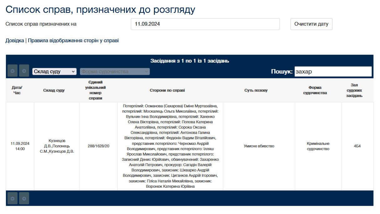 «Сьогодні, 11.09.2024 р., під час судового засідання орієнтовно в період часу з 14:50 при обговоренні клопотання прокурора про продовження запобіжного заходу відносно Захаренка А.П., яке було подано ще у червні 2024 р. і не розглянуто з об’єктивних причин, обвинувачений Захаренко А.П., не дивлячись на заперечення захисника, адвоката К.Воронюк щодо необґрунтованості вказаного клопотання та його безпідставності, а також щодо того, що клопотання відповідає дійсним обставинам та матеріалам провадження, обвинувачений Захаренко А.П., висловлюючи свою позицію стосовно зазначеного клопотання, звернувся до суду з проханням застосувати до нього в якості забезпечення кримінального провадження найтяжкий запобіжний захід у вигляді тримання під вартою.