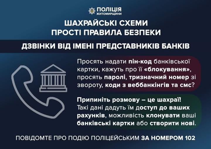 - пам’ятайте, що співробітники банків не телефонують із подібними вимогами та не просять переказувати кошти;