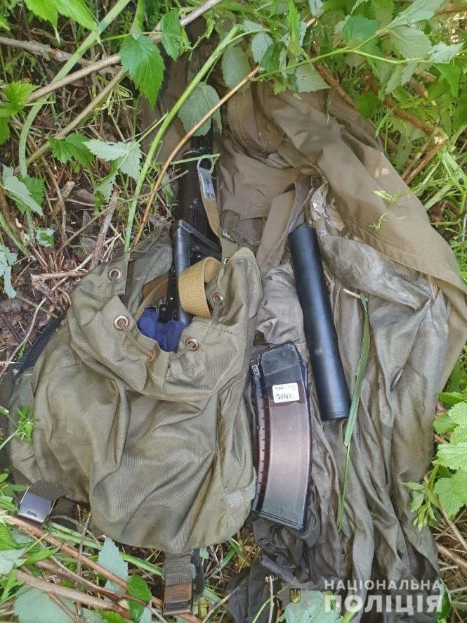 Згодом у сховку у чагарнику правоохоронці виявили і мопед, яким уночі пересувався підозрюваний, і рюкзак зі зброєю та боєприпасами. У ноші були автомат АКСУ калібру 5,45 та дві ручні гранати.