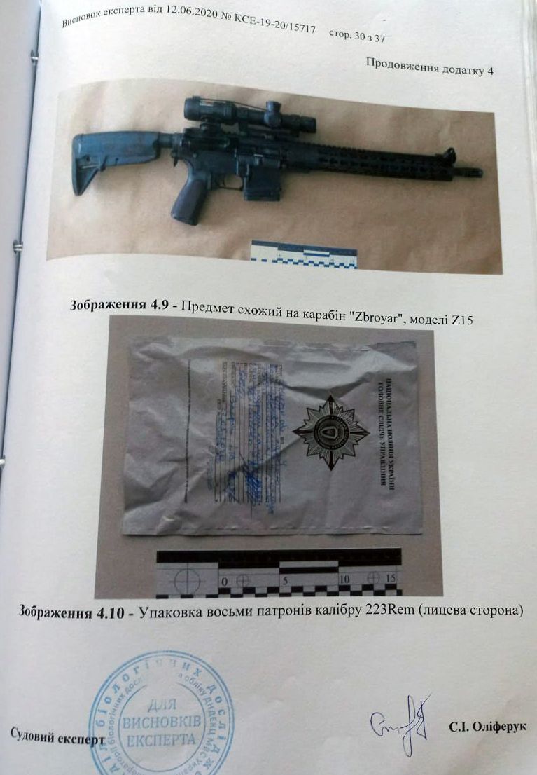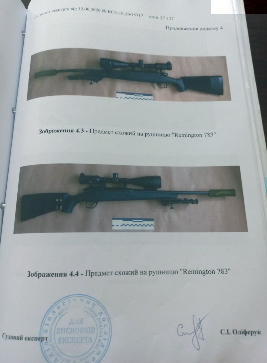 Наприклад, під час судового засідання 3 липня 2023 судом було оголошено про експертні висновки, де предметом дослідження були два предмета, схожі на рушницю «Remington 783» та на карабін «Zbroyar» моделі Z15.
