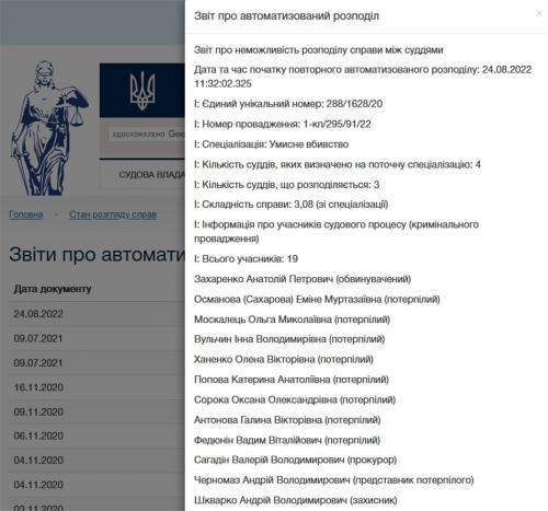 На сайті Єдиного державного реєстру судових рішень з’явилася Ухвала від 23.08.2022 року Богунського районного суду м. Житомира в колегіальному складі: головуючого судді Зіневич І.В., суддів Болейко А.П., Панченко Г.В., якою суд постановив заяву про самовідвід судді Зіневич І.В. задовольнити. Також цією ж Ухвалою Кримінальне провадження про обвинувачення Захаренка А.П. за п.1 ч.2 ст.115, ч.2 ст.15 п.1 ч.2 ст.115 КК України передається до канцелярії Богунського районного суду м. Житомира для заміни судді Зіневич І.В. іншим суддею автоматизованою системою документообігу Богунського районного суду м. Житомира. Ухвала оскарженню не підлягає.