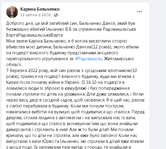 Мне звати Каріна Бельченко, я б хотіла висвітлити історію вбивства моєї дитини, Бельченко Даніїла(12 років), якого вбили на подвір’ї власного будинку представники місцевого територіального угрупування м. #Радомишль, Житомирської області.