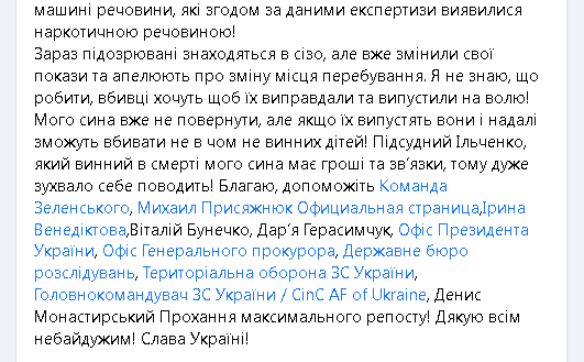 Мого сина вже не повернути, але якщо їх випустять вони і надалі зможуть вбивати не в чом не винних дітей! Підсудний Ільченко, який винний в смерті мого сина має гроші та зв’язки, тому дуже зухвало себе поводить! Благаю, допоможіть Команда Зеленського, Михаил Присяжнюк Официальная страница,Ірина Венедіктова,Віталій Бунечко, Дар’я Герасимчук, Офіс Президента України, Офіс Генерального прокурора, Державне бюро розслідувань, Територіальна оборона ЗС України, Головнокомандувач ЗС України / CinC AF of Ukraine, Денис Монастирський Прохання максимального репосту! Дякую всім небайдужим! Слава Україні!".