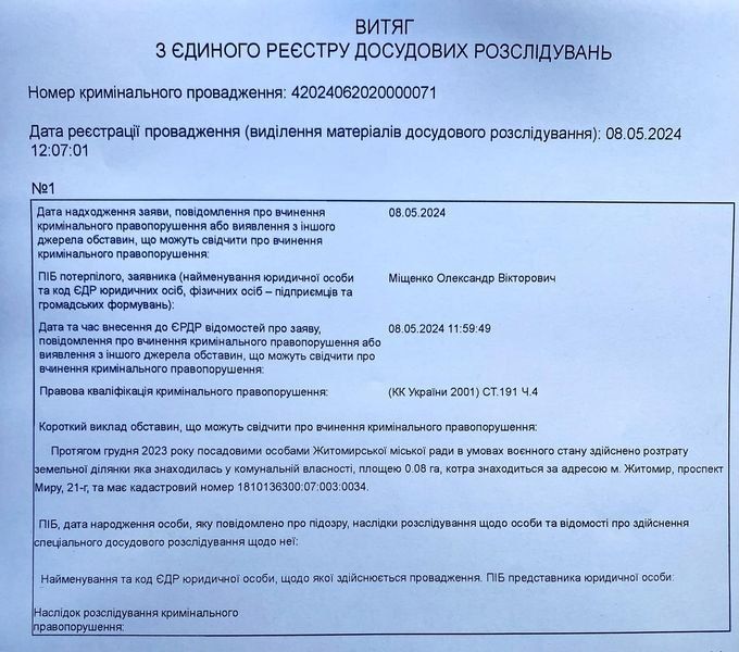 Прокуратура внесла відомості до єдиного реєстру досудових розслідувань та відкрила кримінальне провадження по факту розтрати посадовими особами Житомирської міської ради земельної ділянки, площею 0,08 га, яблуневого саду, на проспекті Миру, 21-г у Житомирі.