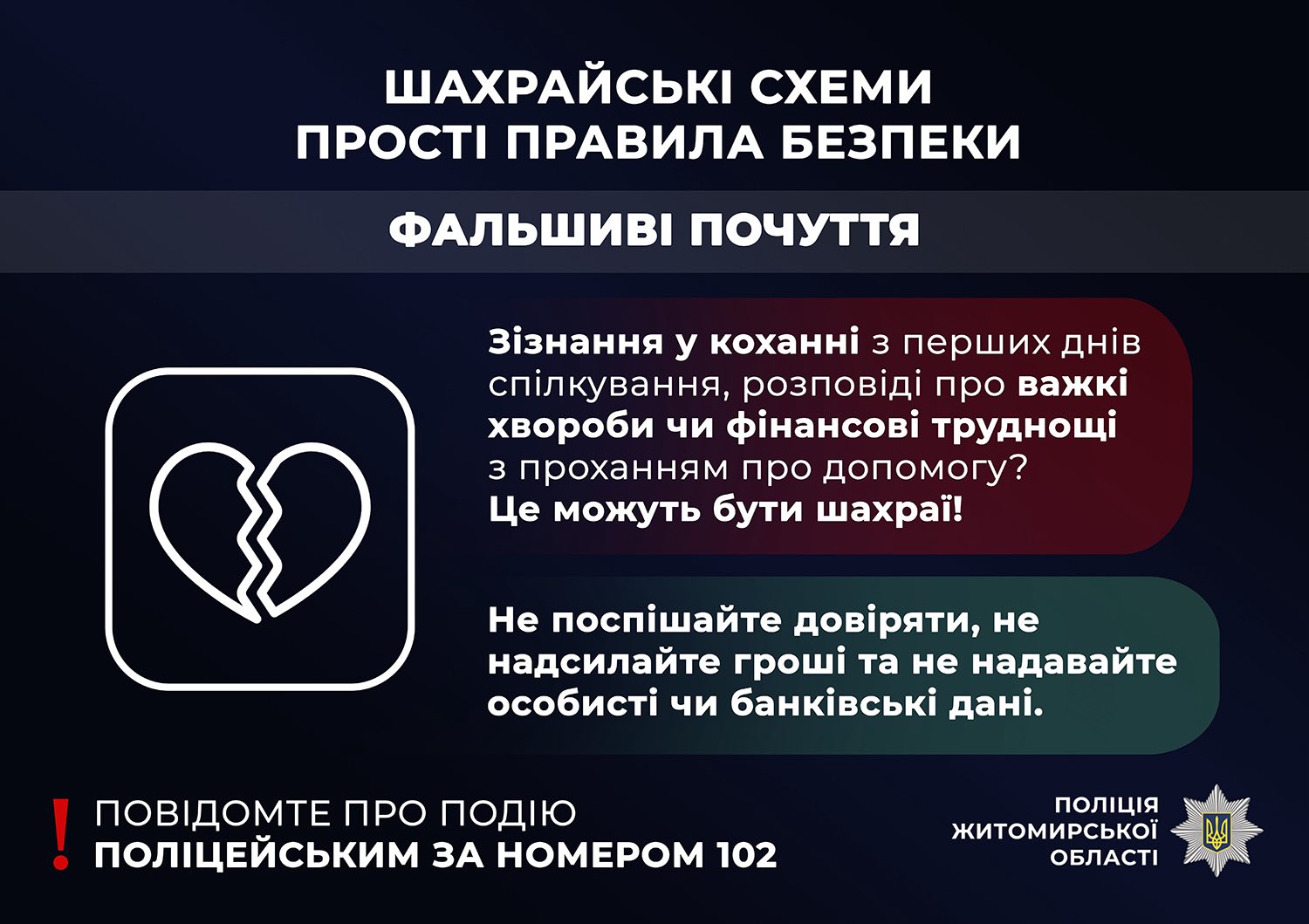 – пам’ятайте, що шахраї в соцмережах можуть називатися будь-ким, використовувати несправжні фото та документи, під різними приводами входити в довіру, тиснути на емоції, аби змусити вас переказати кошти.