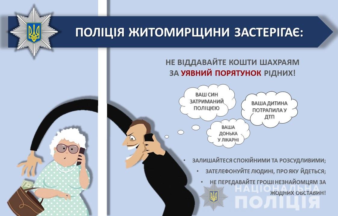 Дві літні жительки м. Коростишева цього ж дня розмовляли телефоном нібито з лікарями. В обох випадках незнайомець повідомляв пенсіонеркам про ДТП та термінові операції їх онук, а відтак необхідність значних коштів. Обидві жінки, не роздумуючи, віддали наявні у них заощадження: у першому випадку – 20 тисяч гривень, а в другому – 11 тисяч гривень. Гроші забирали посередники, приїхавши до місць проживання пенсіонерок.