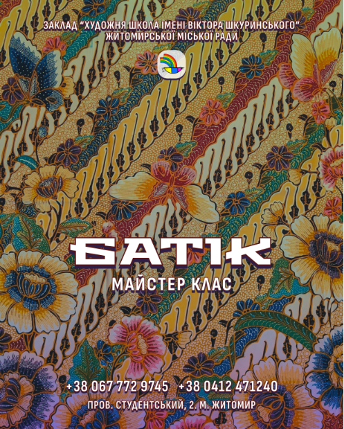 Щонеділі (22 жовтня, 29 жовтня, 5 листопада, 12 листопада і т.д.) о 18:30 на усіх бажаючих чекатимуть у Художній школі імені Віктора Шкуринського на майстер-клас з батику.