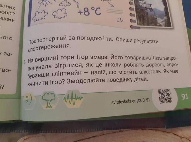 У підручнику «Я досліджую світ» для третьокласників автори запитують у школярів, чи варто у горах грітися глінтвейном з алкоголем, як це іноді роблять дорослі.