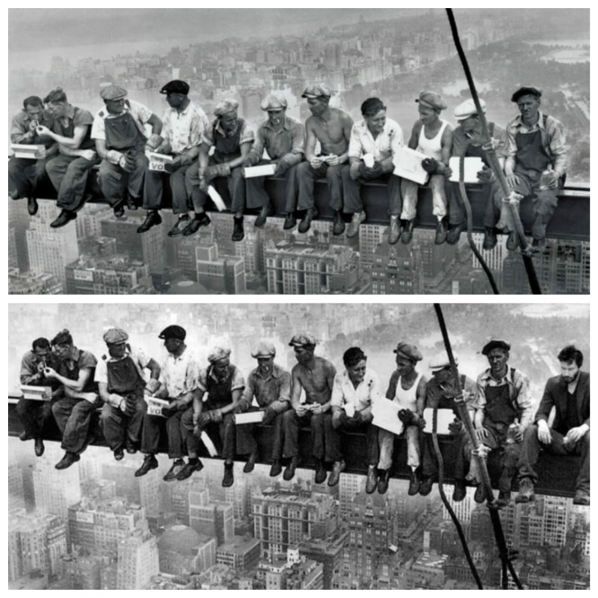 В українському підручнику зі всесвітньої історії за 10 клас знайшли знімок, на якому канадський актор Кіану Рівз обідає разом з будівельниками. Зображення зірки Голлівуду прифотошопили до світлини «Обід на хмарочосі» 1932 року, яке мало б проілюструвати індустріальне зростання США.