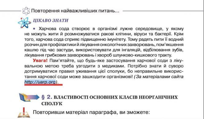 В українському підручнику з хімії дев’ятикласникам розповіли, що сода лікує рак. При цьому автори посилаються на сайт Всеукраїнської асоціації пенсіонерів. Цей підручник видали у 2017 році, він рекомендований Міністерством освіти і науки України.