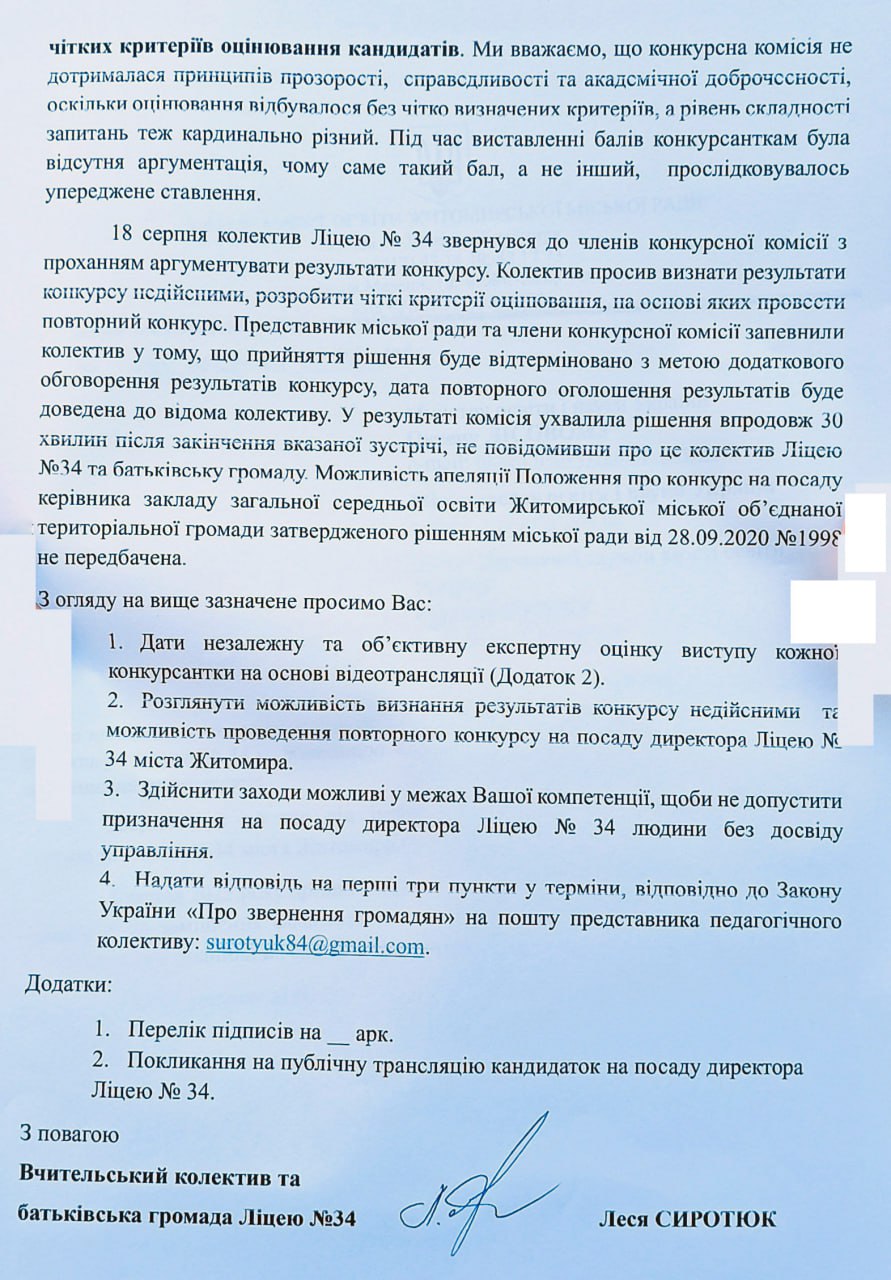 У мене в руках лист, який ми колективом і батьківською громадою направили міністру освіти і науки Оксену Лісовому, МОН України та голові Державної служби якості освіти Руслану Граку. Ми описали, як проходив конкурс і чому маємо підстави вважати його необ’єктивним.