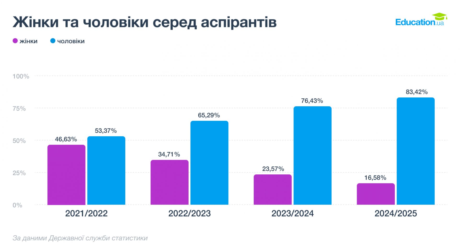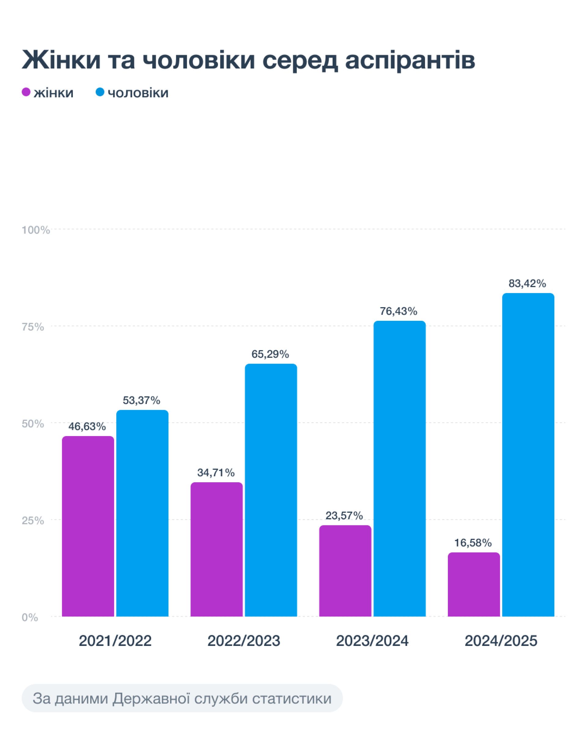 На рівні аспірантури гендерний баланс в останні роки не просто зміщується — він ламається. А все тому, що у 2023/2024 роках аспірантура для чоловіків призовного віку стала не стільки академічним кроком, скільки механізмом для оформлення відстрочки. Ще у 2022/2023 навчальному році в аспірантурі навчалися 12 306 жінок і 14 083 чоловіки, а у 2024/2025 навчальному році співвідношення жінок до чоловіків становить 8 858 до 44 572. Тож станом на 2025 рік жінки формують близько 17% контингенту аспірантів.