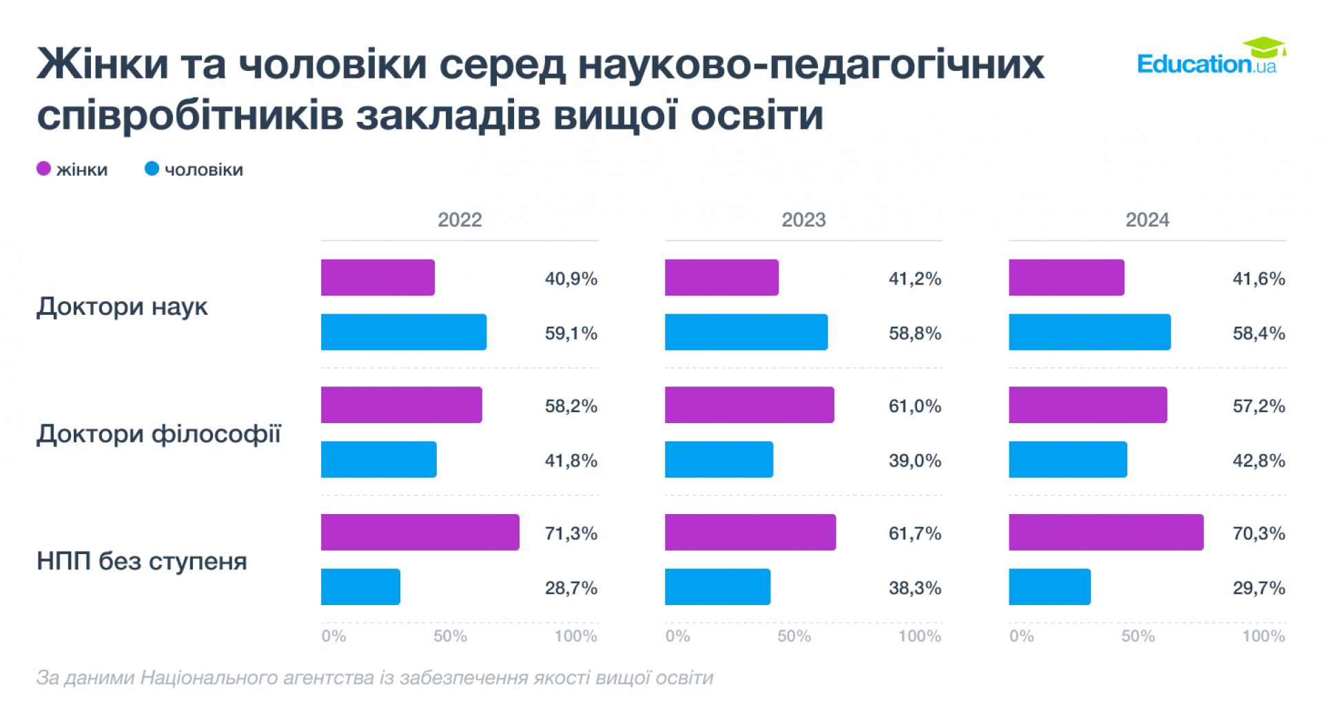 І хоча жінки становлять більшість у системі вищої освіти, коли йдеться про науковий статус, перевагу мають чоловіки. Дані Національного агентства забезпечення якості освіти свідчать: серед науково-педагогічних працівників 70% жінок не мають наукового ступеня. Серед працівників з науковим ступенем кандидата наук або доктора філософії — до 60% жінок, серед докторів наук їх близько 40%.