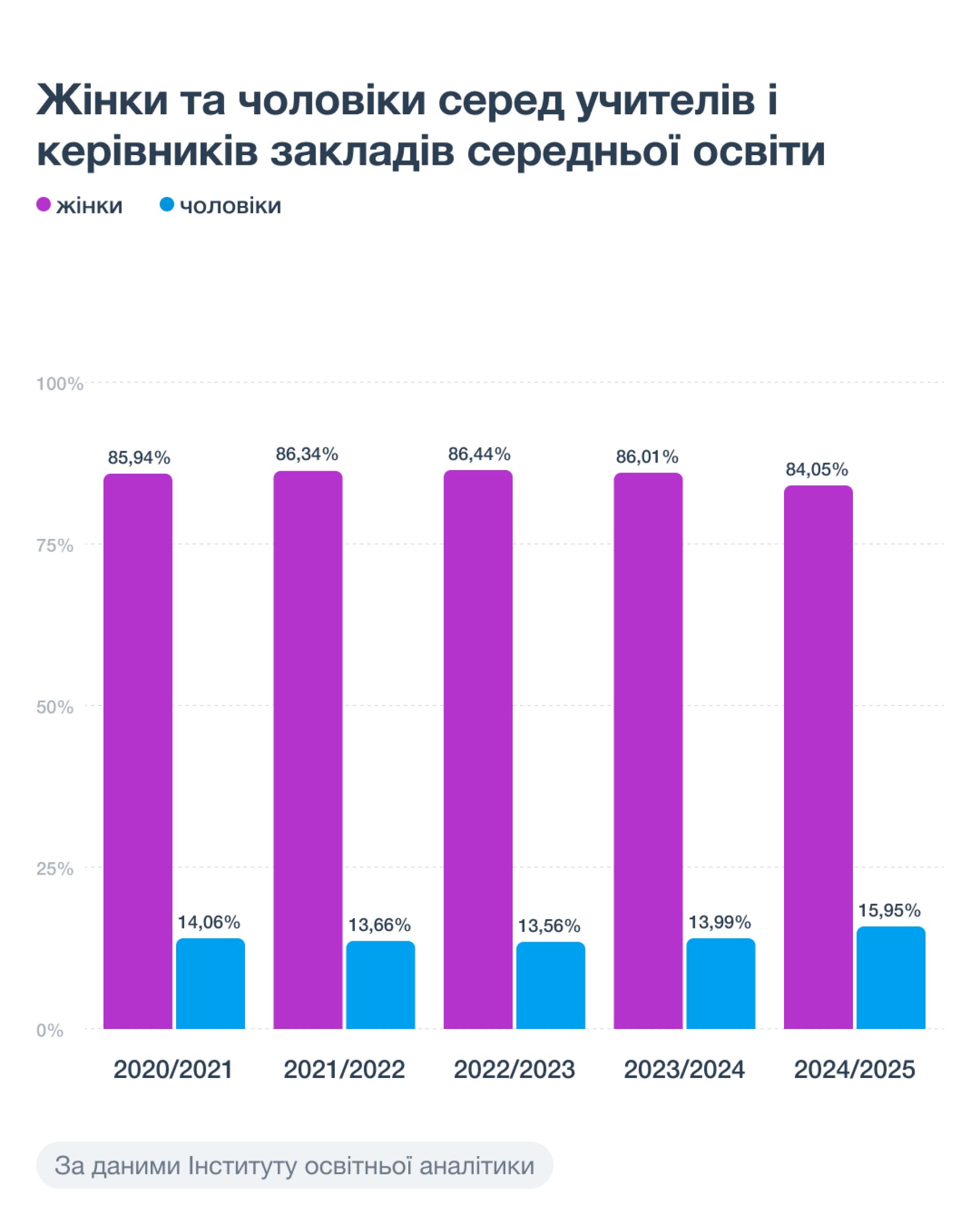 Шкільна освіта — це традиційно жіноча сфера. За даними Інституту освітньої аналітики, жінки становлять у середньому 85% усіх шкільних педагогів.