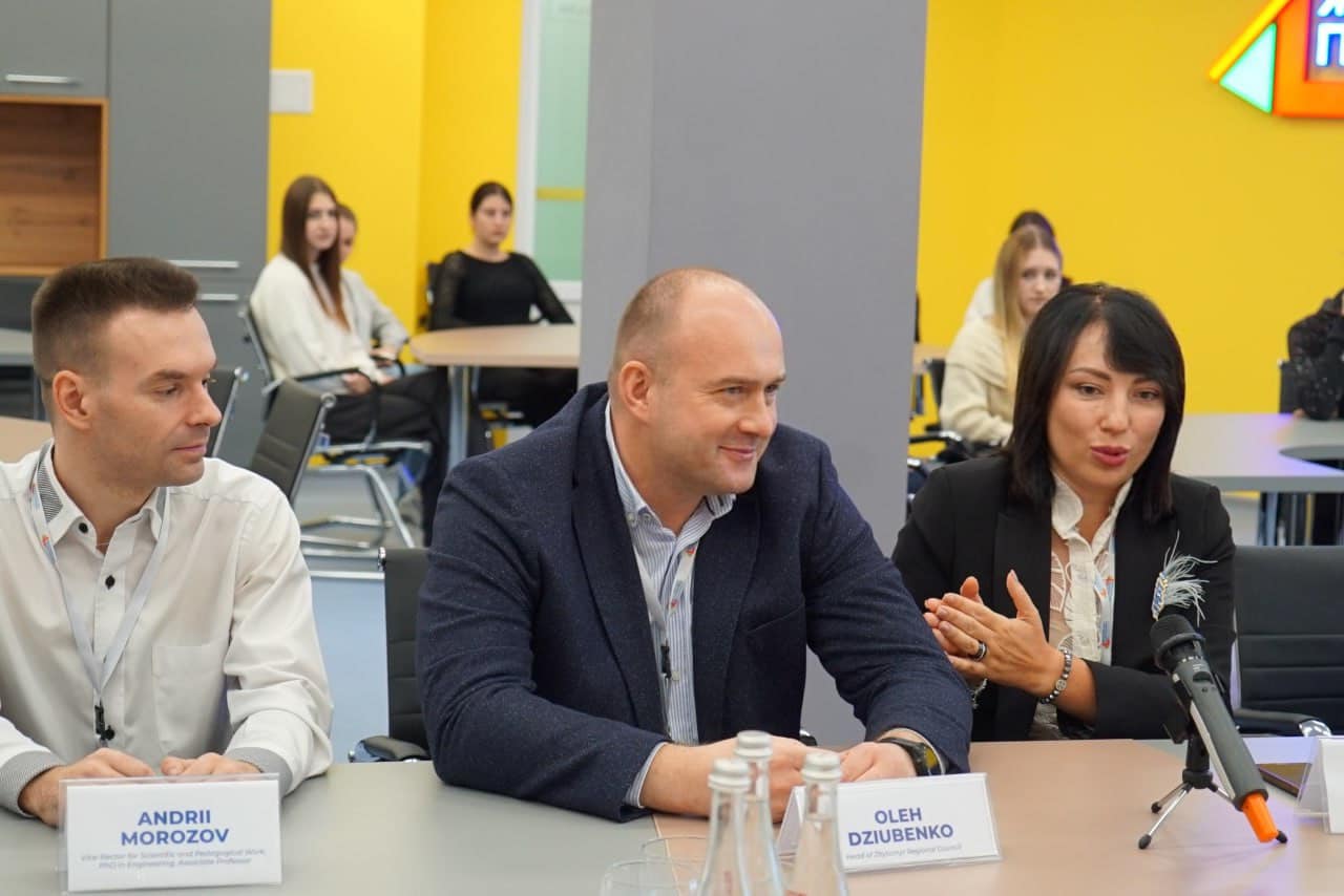 Візит розпочався робочою зустріччю в конференц-залі університету за участі гостей, адміністрації, представників ключових структурних підрозділів та студентів університету. Запрошеними гостями на зустрічі також були: Олег Дзюбенко, в.о. голови Житомирської обласної ради, Олег Пастущак, виконавчий директор БО «БФ «BGV», Сергій Петрик, доктор філософії, педіатричний хірург та фахівець з медичної реабілітації у НДСЛ «Охматдит», Олексій Палієнко, полковник, заступник командира військової частини А 1262 з питань психологічної підтримки, Павло Журбенко, директор Госпіталю ветеранів війни у м. Бердичів, Сніжана Крижба, клінічний психолог Госпіталю ветеранів війни, та Людмила Буханевич, практичний психолог центру «PsyLab».