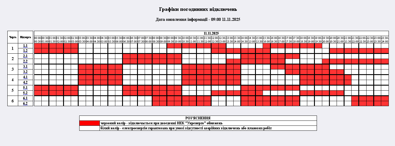 з 00:00 до 24:00 – графіки погодинних відключень (ГПВ) обсягом від 2 до 3,5 черг