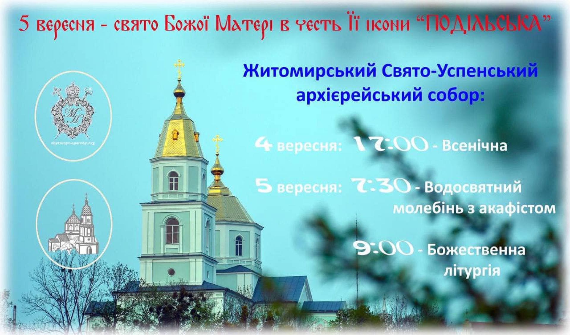 5 вересня Українська Православна Церква молитовно шанує чудотворний образ Божої Матері, що знаходиться у Житомирському Свято-Успенському архієрейському соборі та іменується “Подільська”.