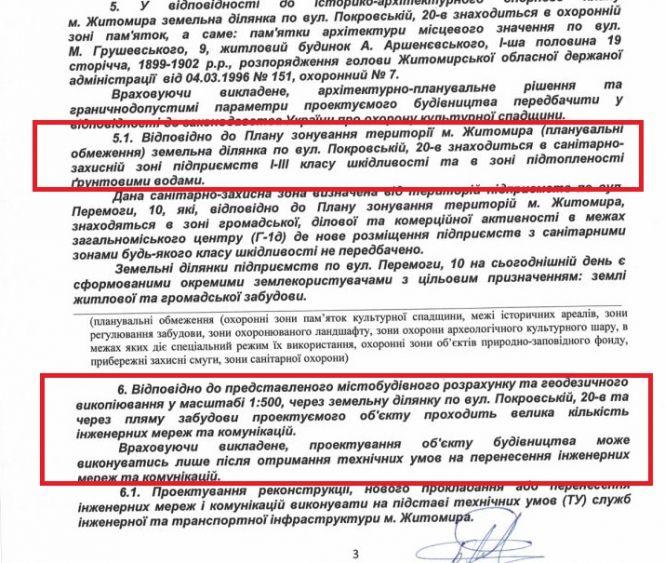 На регулярно підтопленому клаптику землі 13-поверхівка з’явиться на підставі містобудівних умов та обмеження для проєктування об’єкта будівництва. Департамент містобудування та земельних відносин Житомирської міської ради видав їх 24 січня 2018 року під назвою «будівництво багатоквартирного житлового будинку із вбудовано-прибудованими приміщеннями громадського призначення по вул. Покровській, 20-в у м. Житомирі».