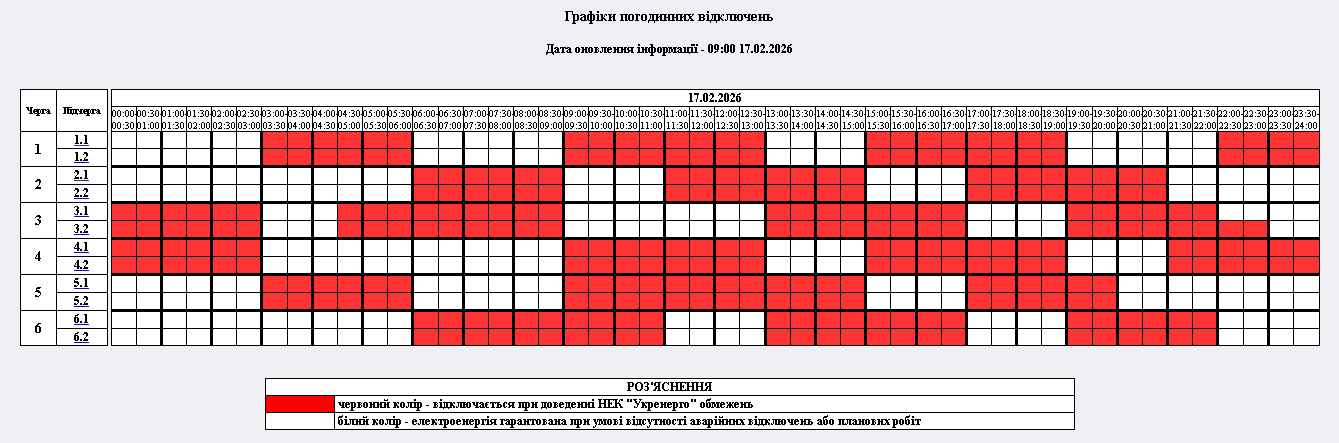 Графіки обмеження споживання електроенергії на вівторок, 17 лютого