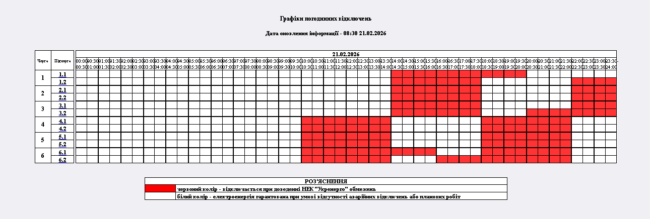 "На 21.02.2026 р. по команді НЕК "Укренерго" буде застосовано: